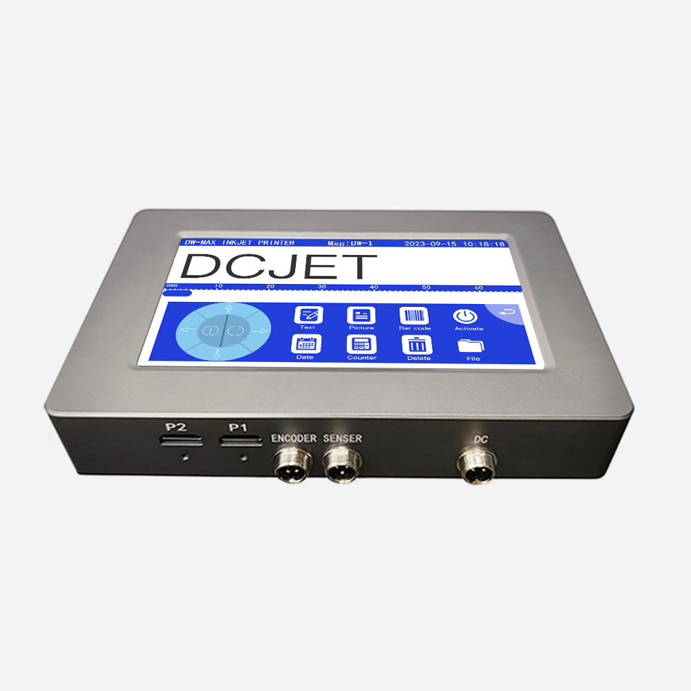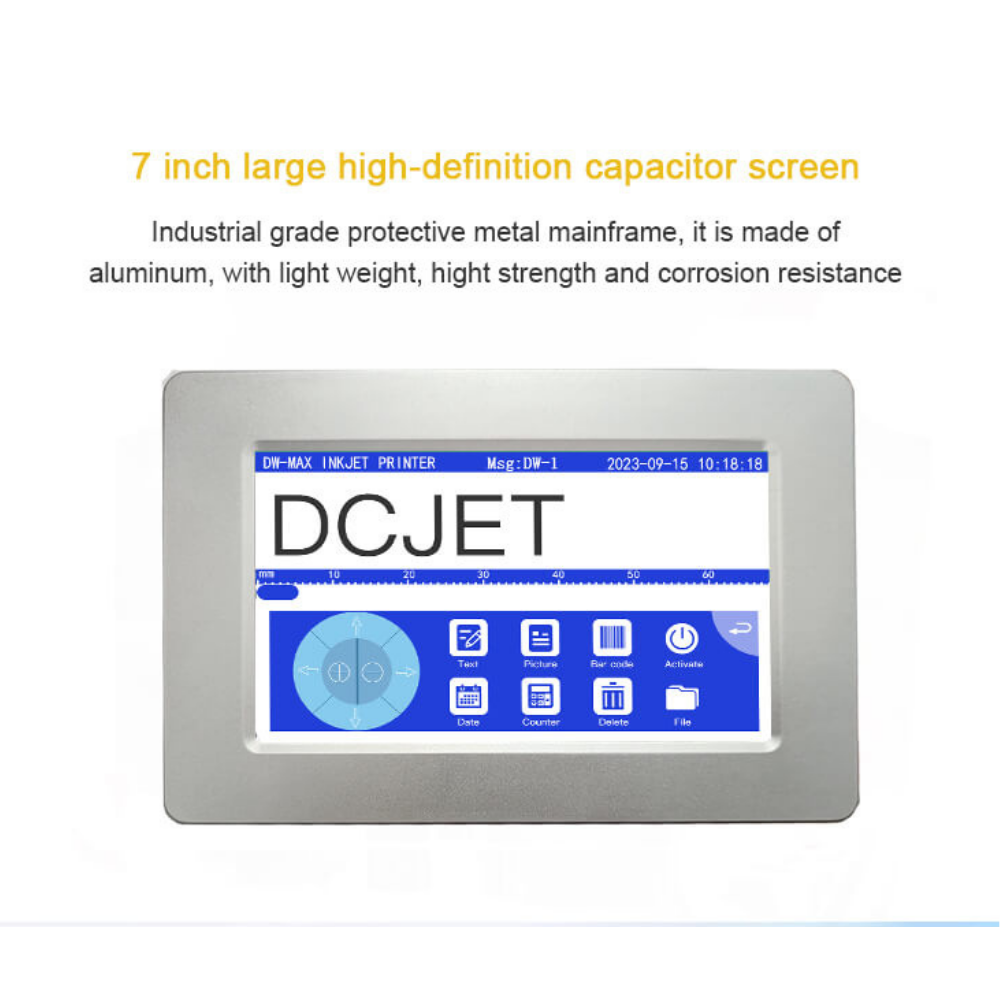 The DC Jet DWMax is an industrial inkjet printer featuring a 25.4mm print height and TIJ 2.5 thermal foaming technology for large-character marking on cartons, pipes, metal, and plastic. Equipped with a 7-inch touchscreen, aluminum alloy body, and RFID-enabled ink cartridges, it delivers high-speed (40m/min), 300 DPI printing of bold text, logos, barcodes, and QR codes. Its versatile ink options—water-based and solvent-based in multiple colors—make it suitable for diverse industrial coding applications.